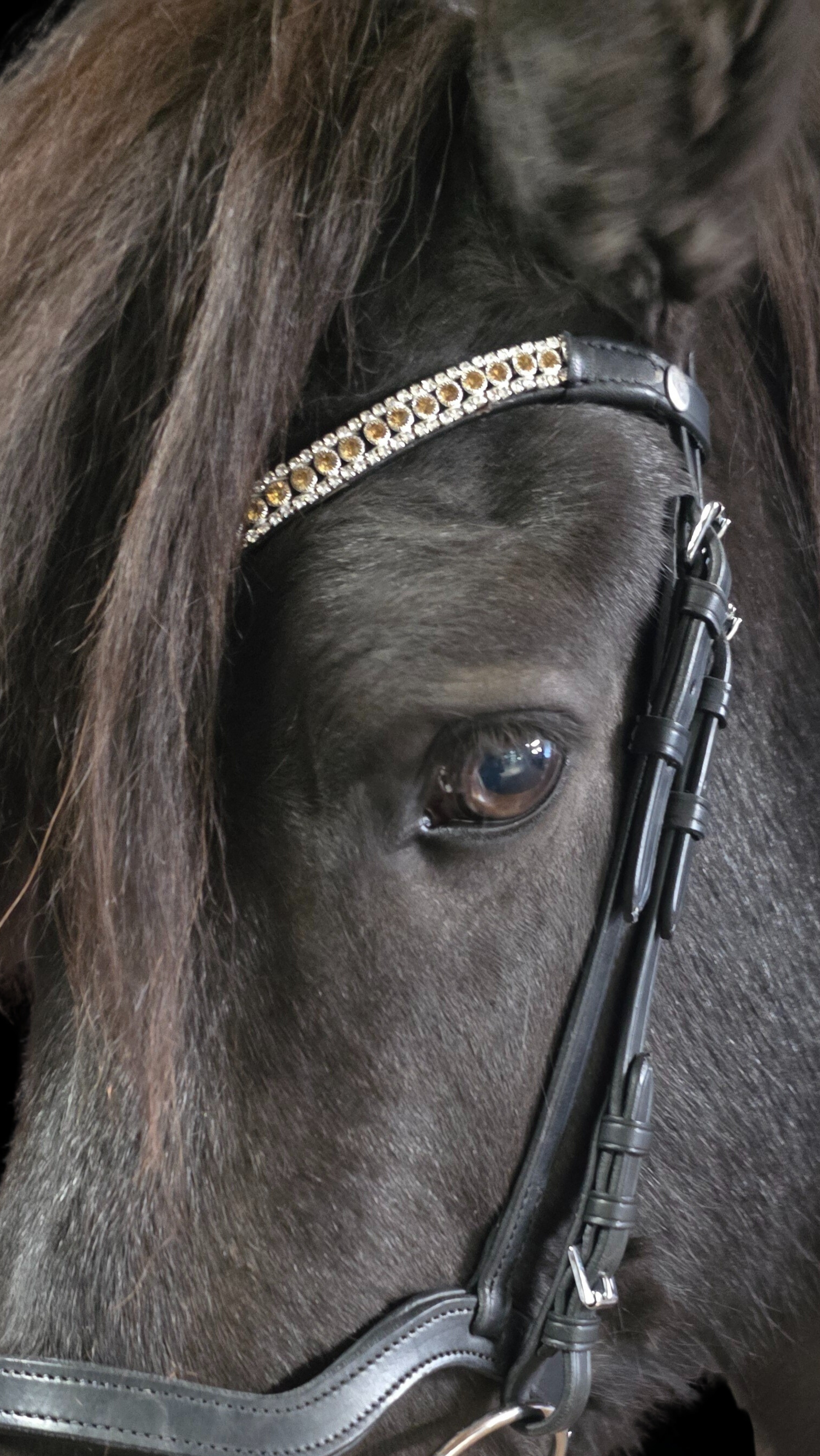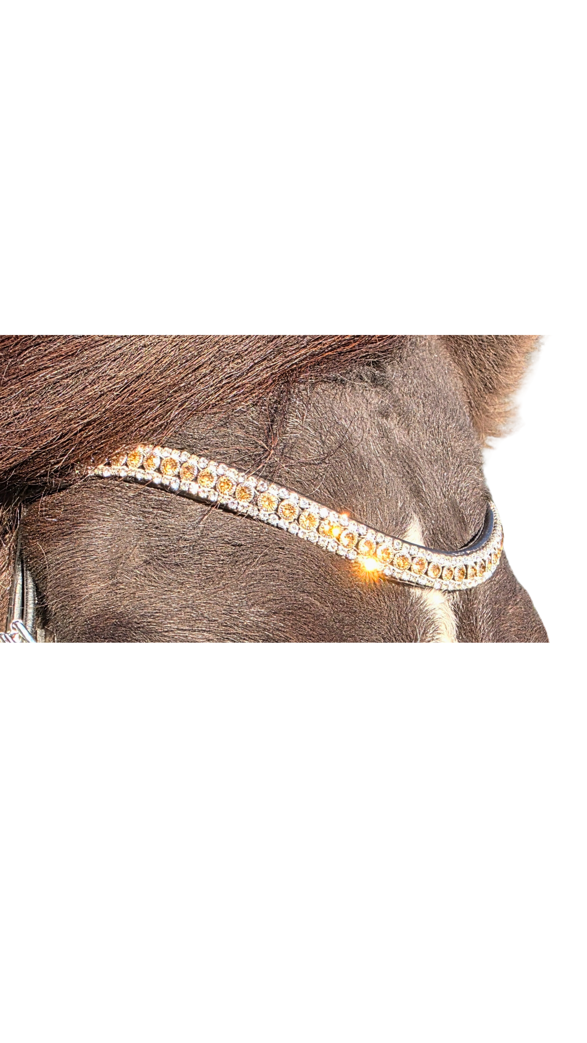 In seiner Linie sitzen größere, gelb schimmernde Steine, die oben und unten von zarten Reihen kleiner, weißer Steine umrahmt werden. Die gelben Steine verleihen dem Zaum einen warmen, fast sonnigen Glanz, während die weißen Steine wie feine Lichtpunkte wirken und den goldenen Ton zusätzlich hervorheben. Das Zusammenspiel erinnert an ein edles Schmuckband – elegant, aufmerksamkeitsstark, aber dennoch stilvoll und nicht überladen.